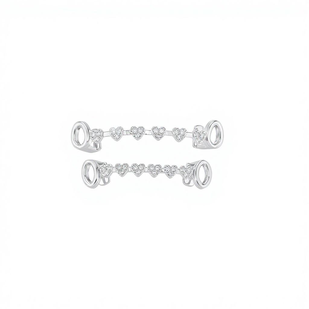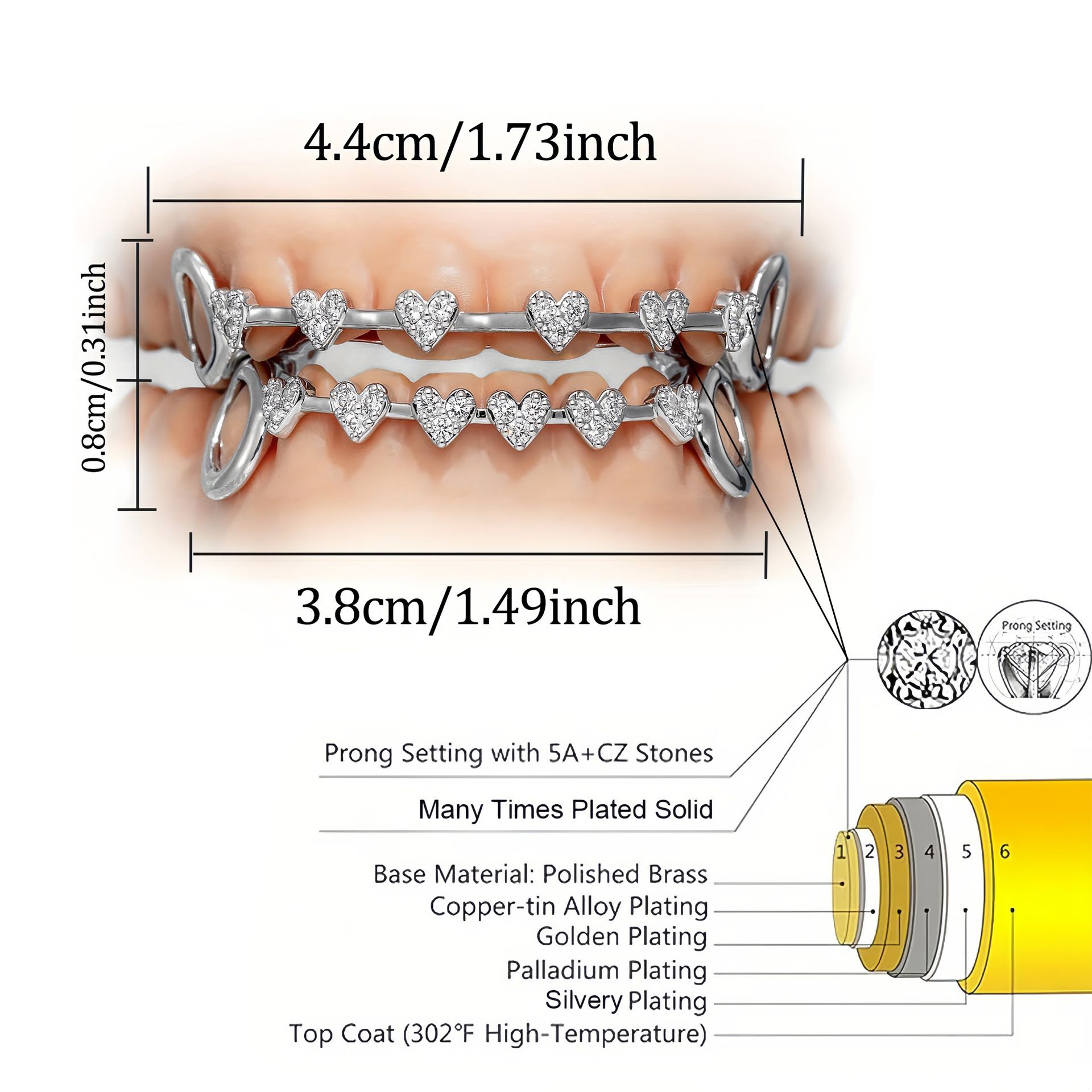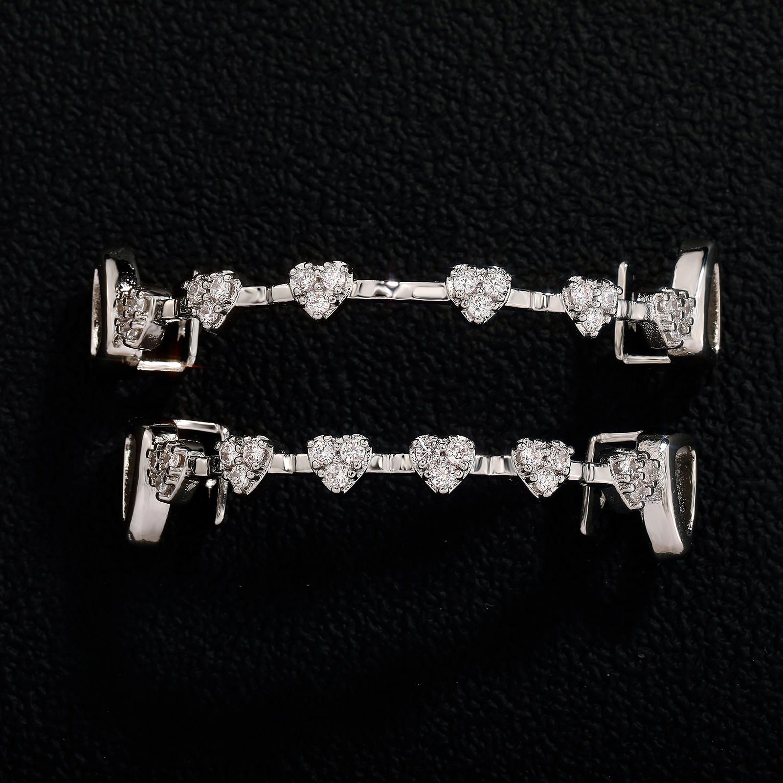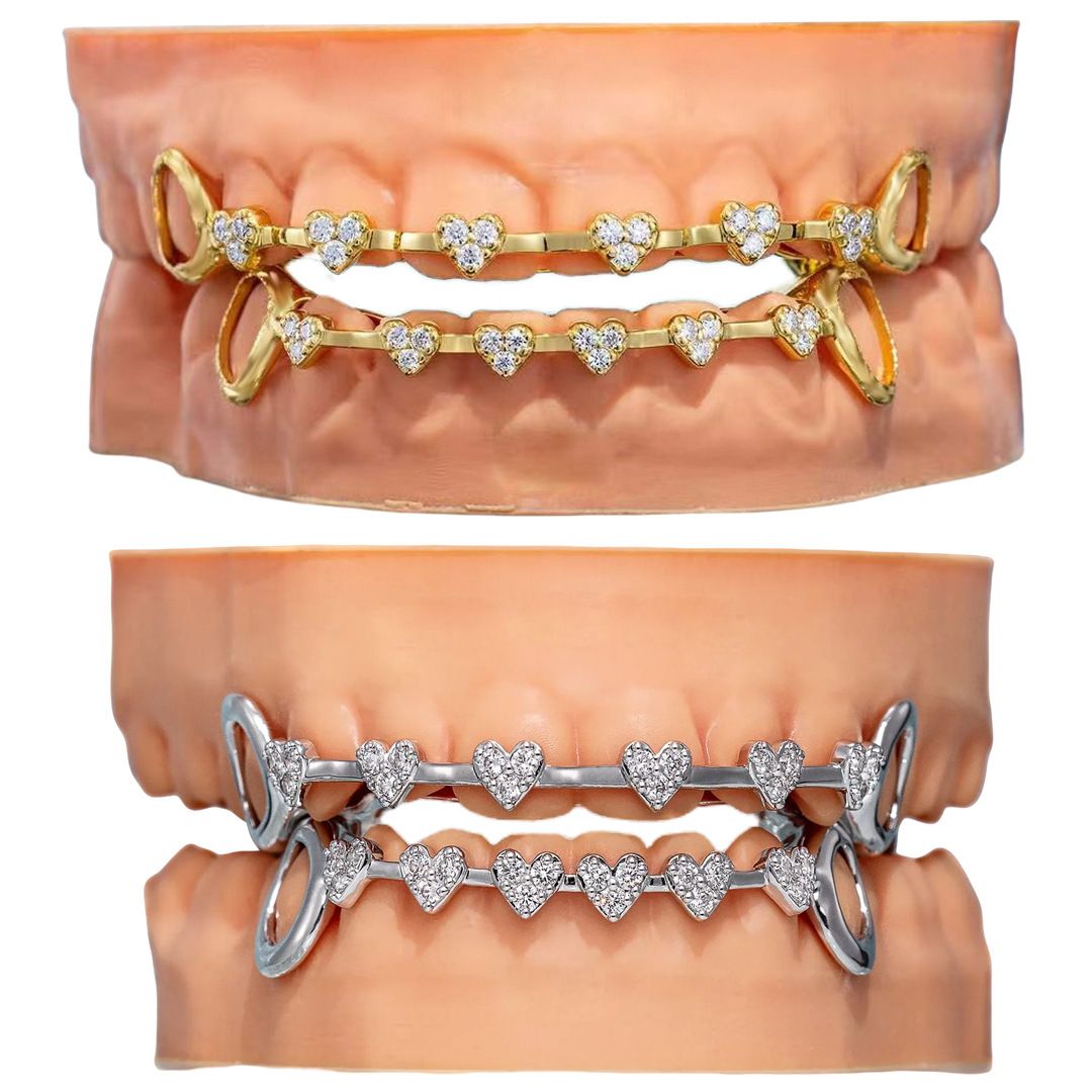 Hip-hop dental grill, real gold electroplated, 8 teeth, micro-inlaid with hearts and fully studded with diamonds