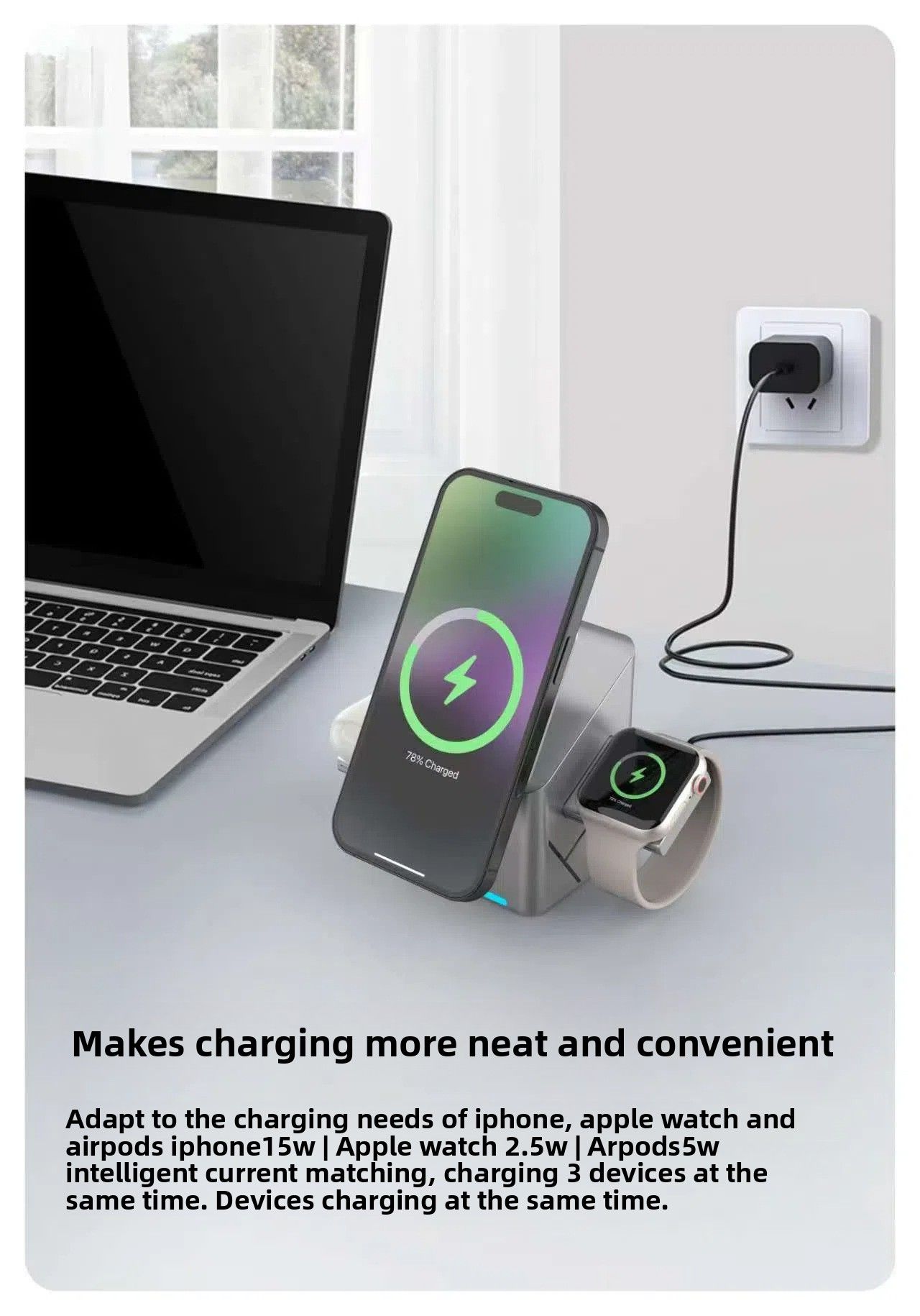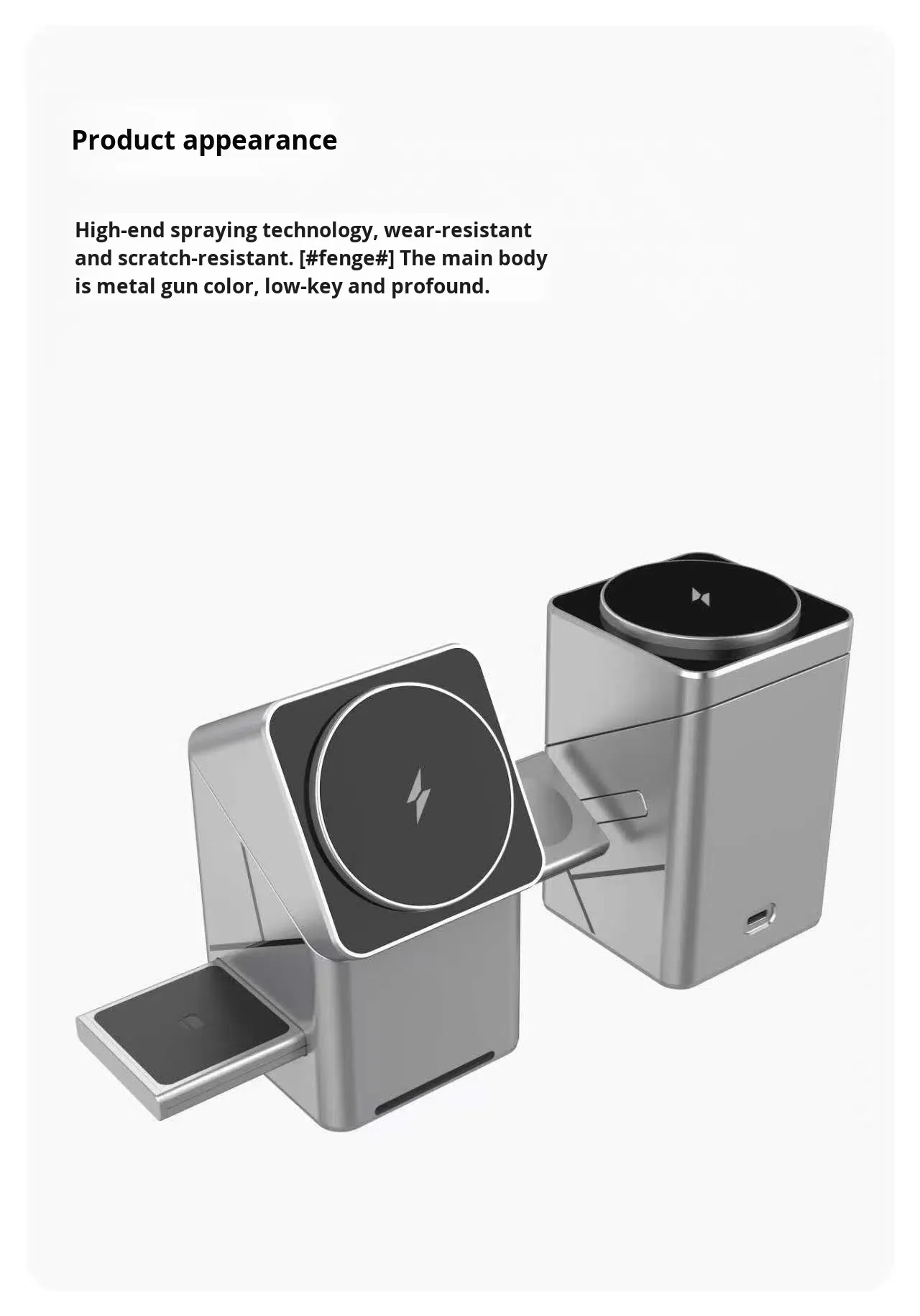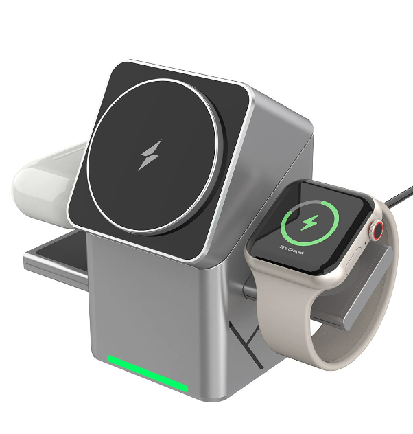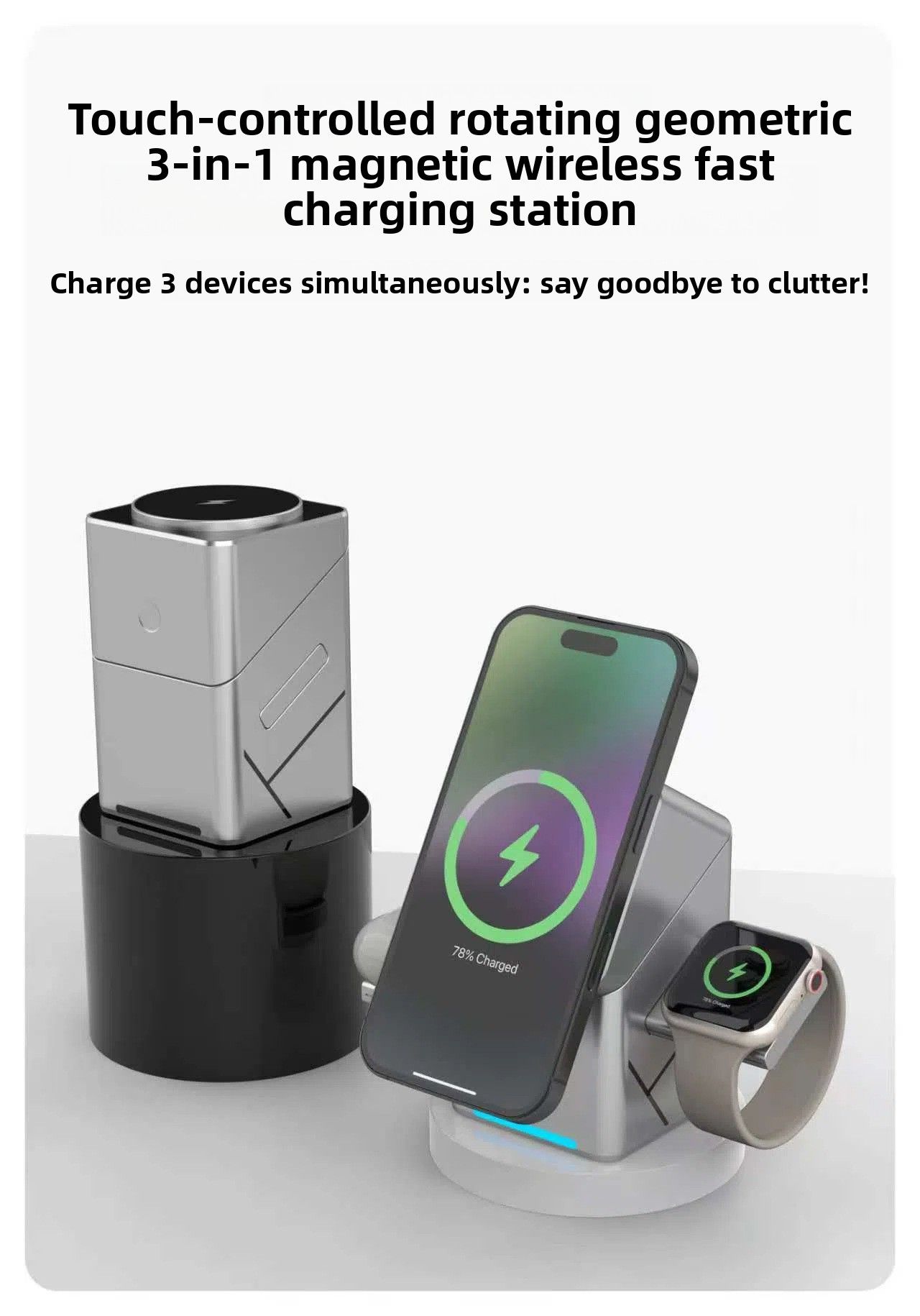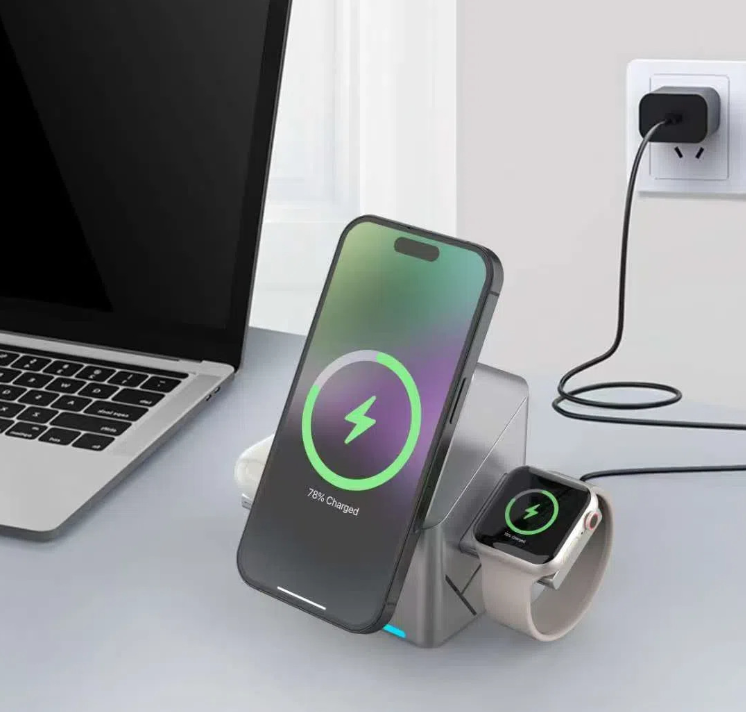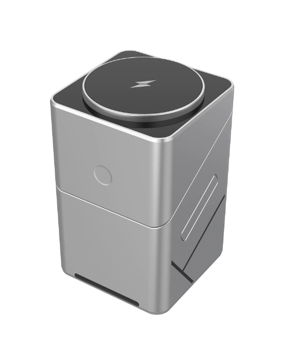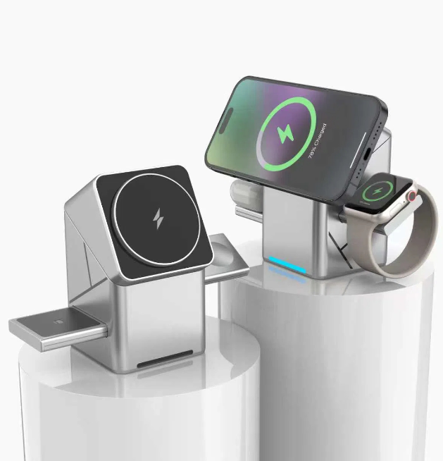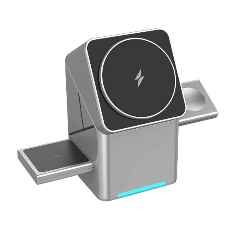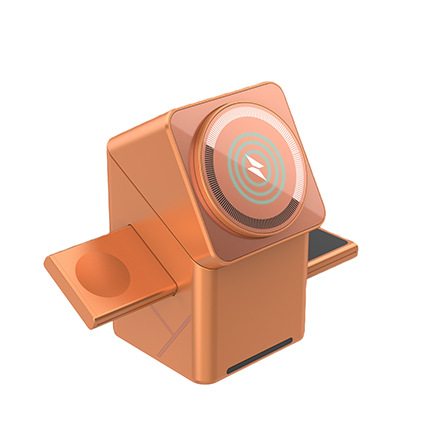 The rotating Rubik's Cube three - in - one magnetic wireless charger is suitable for fast charging of Apple and Samsung mobile phones and smartwatches.